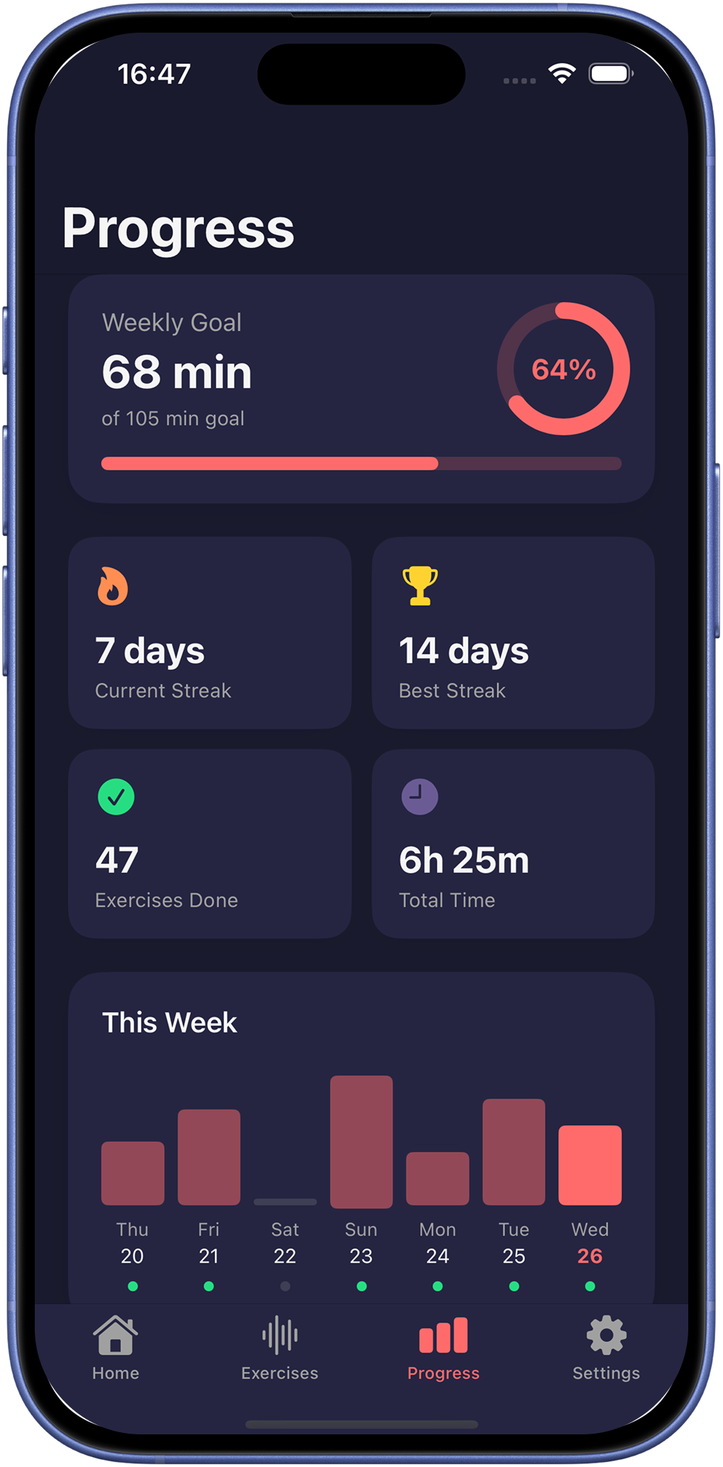 Build daily habits with streak tracking. See your improvement over time with detailed statistics.